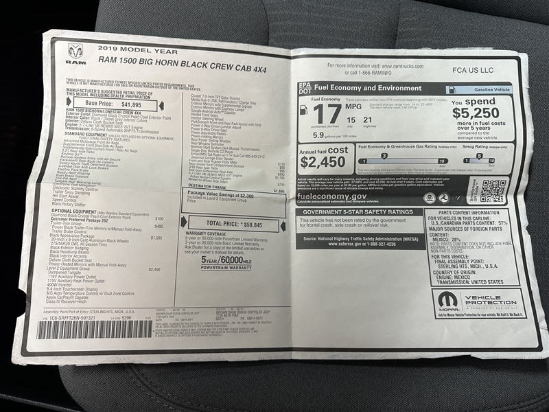 CARFAX guaranteed with a great service history and includes a warranty! Local Mercedes Dealer trade in! Back up camera, XM Satellite Radio, cd player, usb port, auxiliary input, heated seats, heated steering wheel, all power equipment, parking assistant, soft tonneau cover, power sliding rear window, side airbags, dual front airbags, AC, alloy wheels, new rear brakes, and 4 like new Pirelli tires on this EXCEPTIONAL 2019 Ram Crew Cab Big Horn Edition 4x4! A great sounding after-market exhaust alerts your friends that you have arrived! This truck was over $50K brand new! Come and check it out before its gone!