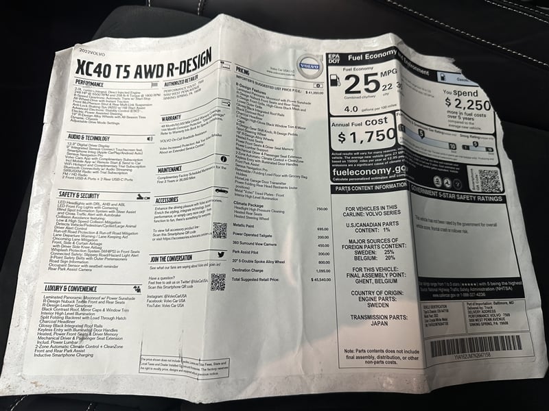 Pennsylvania 1-owner with only 39,499 miles! CARFAX guaranteed and includes a warranty! Navigation, back up camera, blind spot monitoring with rear cross traffic alert, lane departure warning, Apple Carplay, Android Auto, heated memory seats, heated steering wheel, rear heated seats, leather interior, all power equipment, pano roof, power tailgate, XM Satellite Radio, usb port, auxiliary inout, bluetooth, steering controls, side airbags, dual front airbags, AC, 20'' alloy wheels, and 4 strong Cooper tires on this very clean 2022 Volvo XC40 T5 all wheel drive R-Design! This is a very clean SUV and the best price around! Come and check it out before its gone!